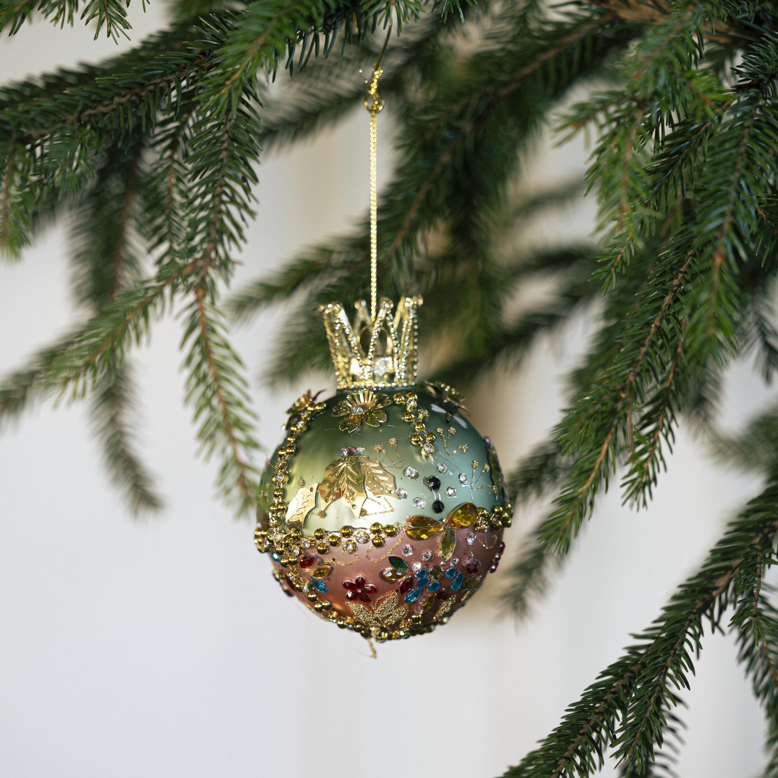 Tämä ainutlaatuinen Kartanon mehiläiset -koristepallo sädehtii kuin kultainen hunajakenno talviauringossa. Hempeän vihreän ja roosan sävyinen pallo on koristeltu kimaltelevilla jalokivillä, kultalehdillä ja suloisilla mehiläisillä – kunnianosoituksena kartanon omalle mehiläistarhalle. Kruunumainen yläosa ja tarkkaan asetellut yksityiskohdat tekevät siitä arvokkaan lisän joulupuuhun.
