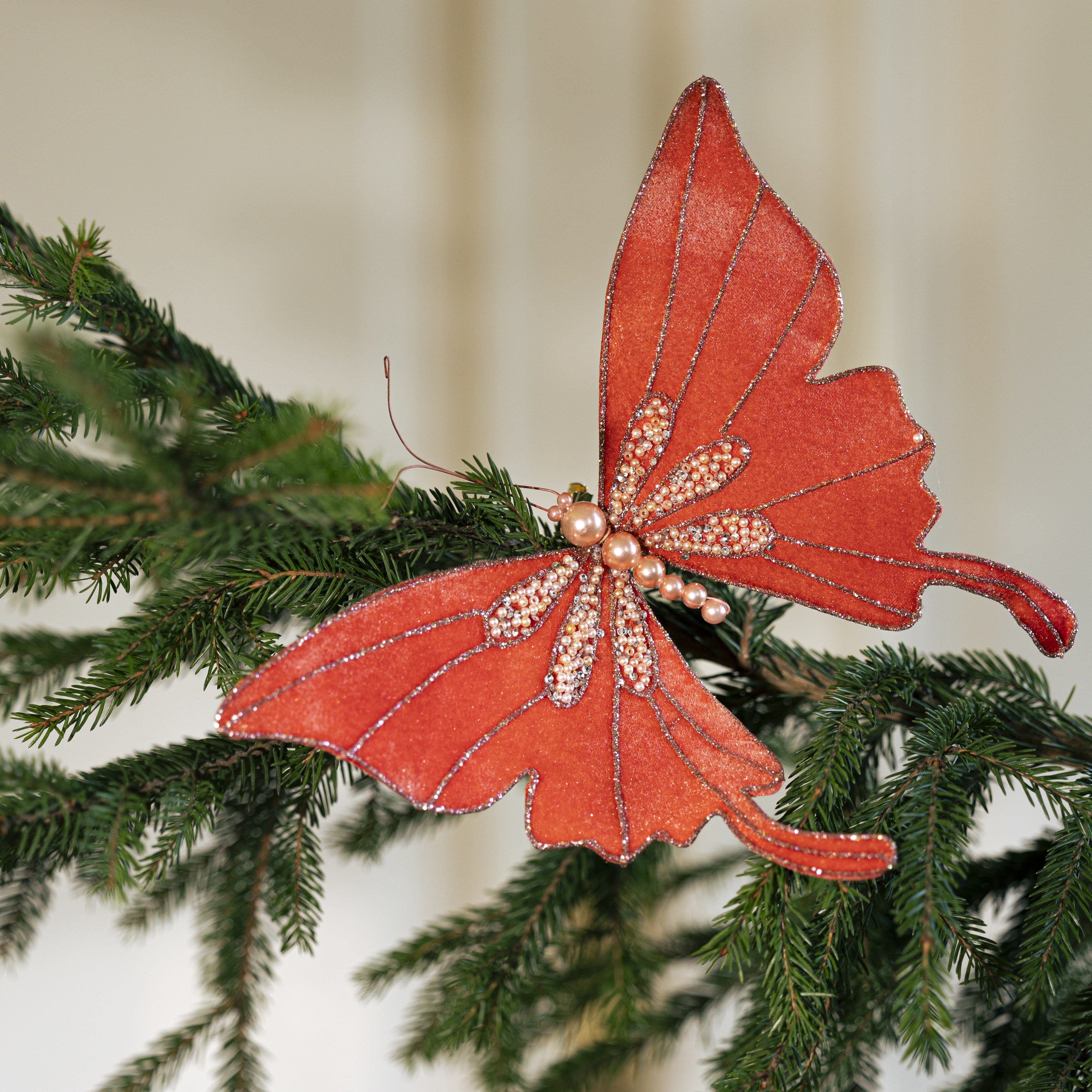 Näyttävä korallinsävyinen perhonen levittää siipensä kuin kesän muisto keskellä talvea. Kimaltavat yksityiskohdat tuovat ripauksen leikkisää eleganssia juhlakoristeisiin.