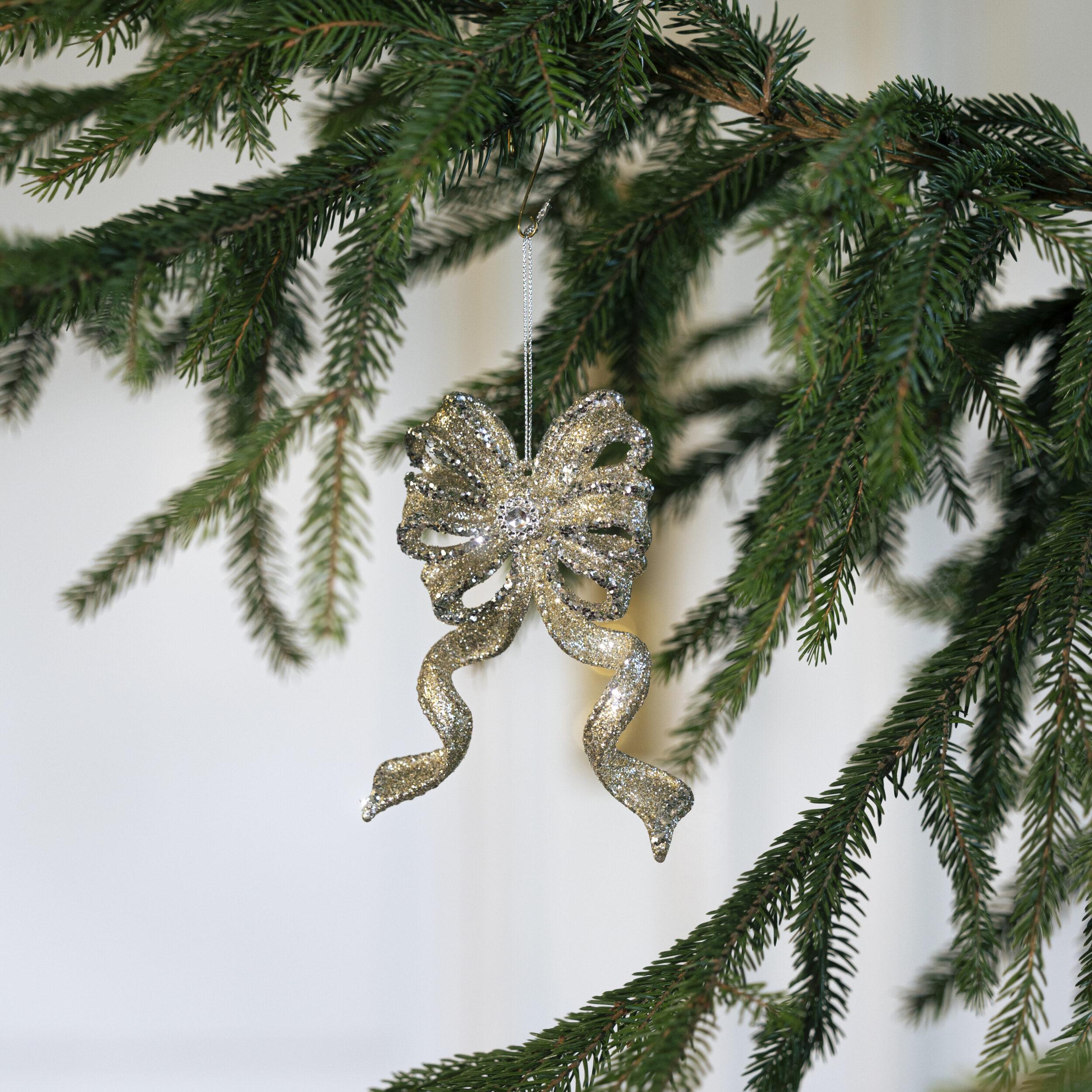Tämä säihkyvä kultahopeinen rusetti tuo kuuseen ripauksen juhlan taikaa ja kartanon eleganssia. Koristeen kimaltava pinta ja keskellä loistava kristalli heijastaa valoa kauniisti, luoden lämpimän ja ylellisen tunnelman joulukotiin.