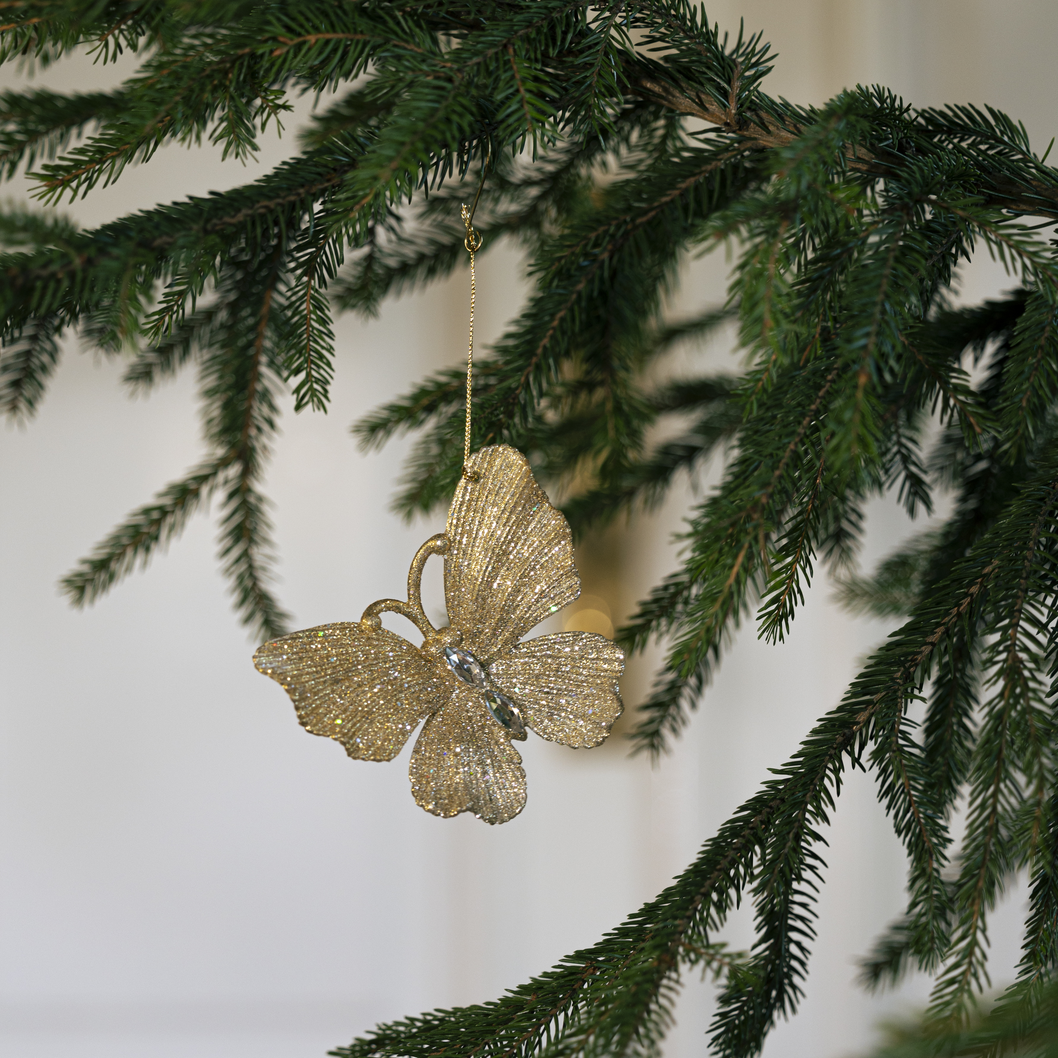 Kimalteleva perhonen levittää siipensä joulun juhlaan. Elegantti ja kevyt koriste symboloi uudistumista ja juhlan keveyttä, täydellinen lisä kuusen latvustoihin tai kranssiin.