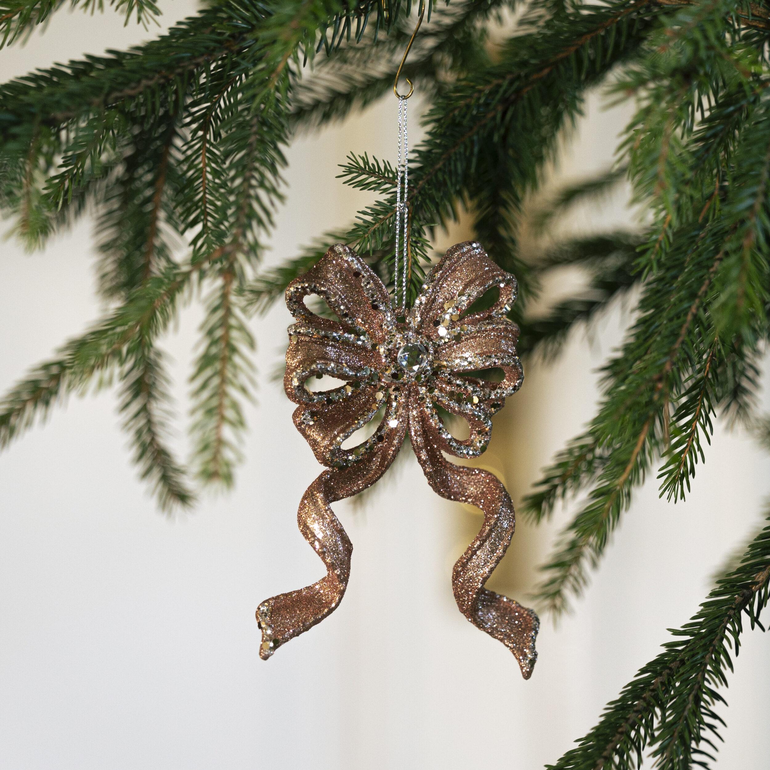 Tämä säihkyvä ruusukultainen rusetti tuo kuuseen ripauksen juhlan taikaa ja kartanon eleganssia. Koristeen kimaltava pinta ja keskellä loistava kristalli heijastaa valoa kauniisti, luoden lämpimän ja ylellisen tunnelman joulukotiin.