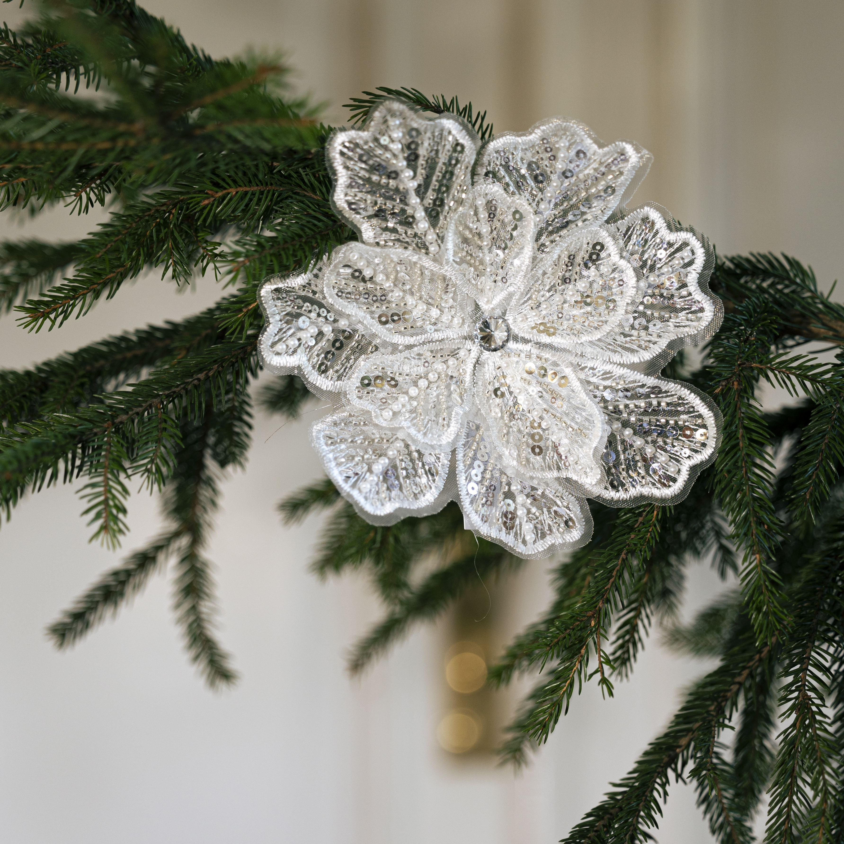 Tämä valkoinen kirjailtu kukkakoriste tuo pehmeää hehkua ja juhlan tuntua koristeluun. Kimaltelevat paljetit sekä helmet ja tyylikäs valkoinen sävy hopea yksityiskohtineen tekevät siitä täydellisen yksityiskohdan joulukuuseen tai kattaukseen.